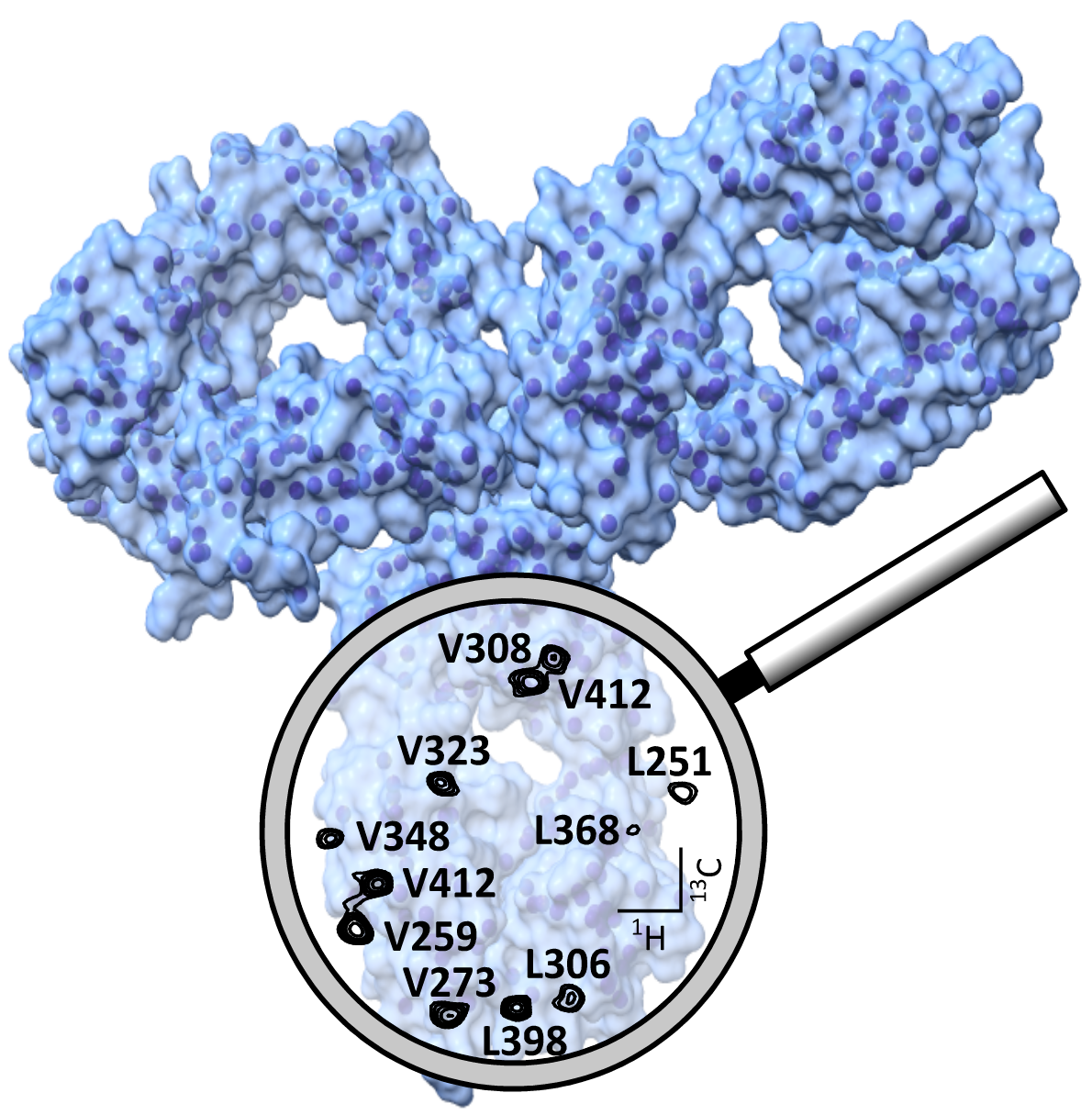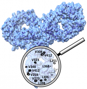 We have extended our methyl specific labelling strategies to 13CH3-labeling of proteins produced in vitro or in eukaryotic cells. This methods enable us to obtain the first assignment of a therapeutic Fab. We are currently applying these approaches to study dynamics of therapeutic mAbs and interaction with human target proteins.