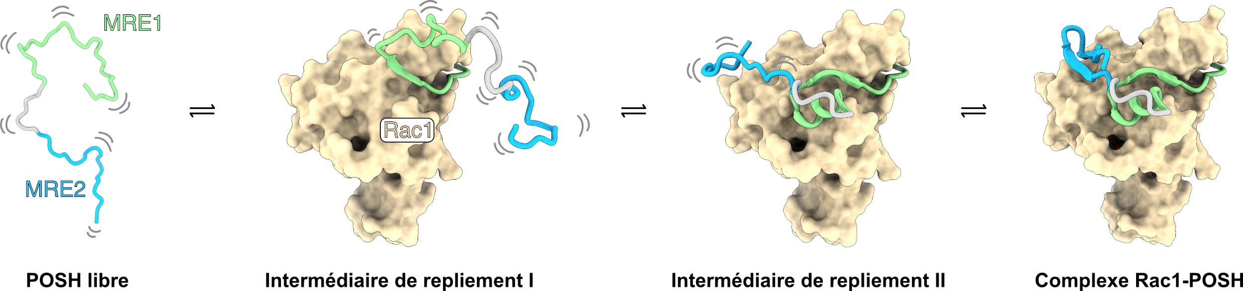 Researchers at the IBS (SIGNAL and EPIGEN groups), in collaboration with teams at the IAB in Grenoble (Palencia) and the ENS in Paris (Bouvignies), investigated the interaction between the intrinsically disordered scaffold protein POSH and the small GTPase Rac1, an interaction which triggers apoptosis via the JNK signaling pathway. Using NMR spectroscopy and X-ray crystallography, they showed that POSH transitions from a disordered ensemble to an ordered bound state through sequential folding events. Initial partial engagement via a CRIB motif anchors the complex and promotes folding of a first recognition element (MRE1), which in turn enables folding of a second element (MRE2). Each step depends on the successful structuring of the preceding one, revealing a hierarchical folding-upon-binding mechanism. These results highlight folding intermediates and conformational transitions as promising targets for therapeutic intervention in IDPs.